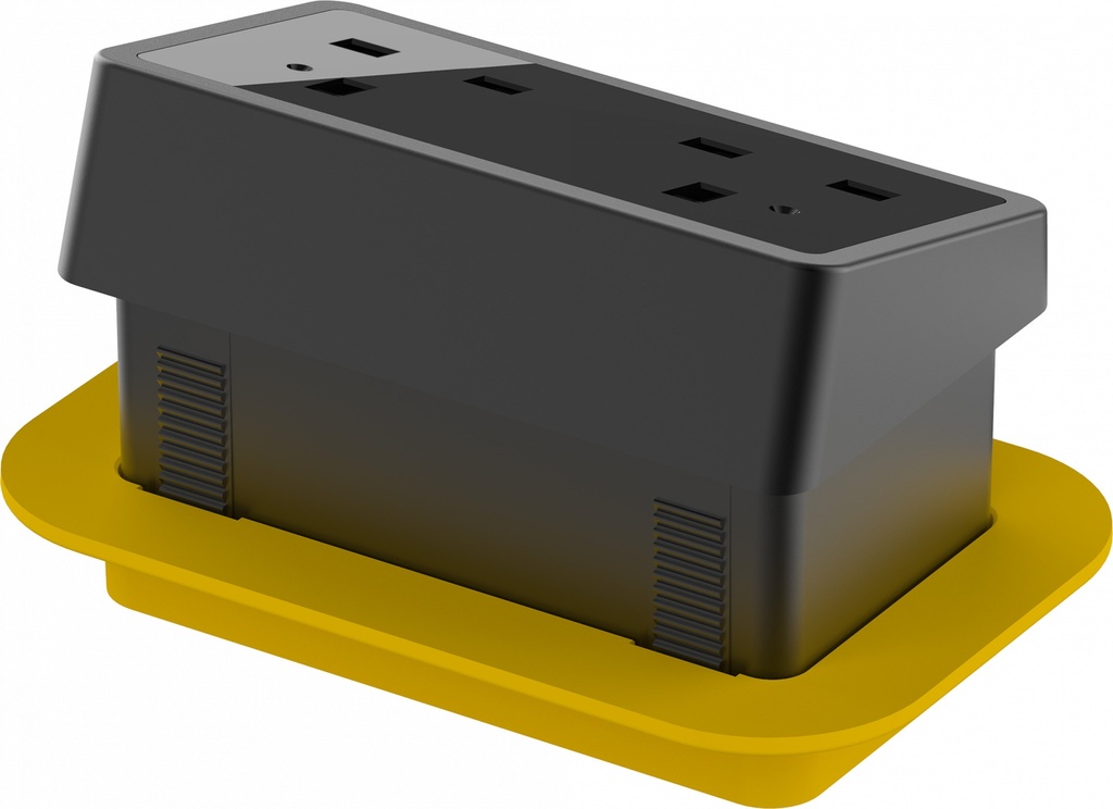 Rectangular in-desk power module with 2X UK power sockets. Fitted with a thermal trip and featuring an aluminium housing with a choice of veneers.